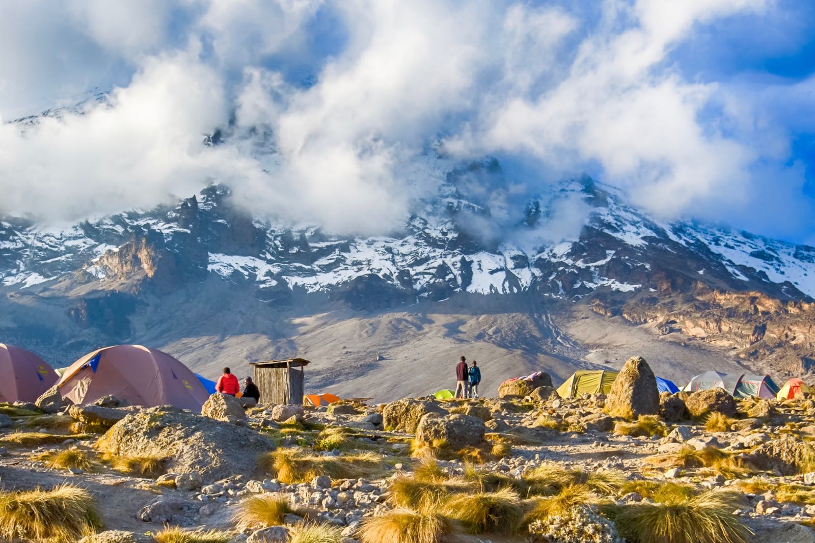 Elevation: 2635m/8645ft to 3487m/11,440ft Altitude gained: 852m After a good night sleep and a hearty breakfast, we continue along moorland terrain on a consistent ascending path. You will catch some terrific views of Kibo and get your first glimpse of the ice fields on the Eastern crater rim. The small shrubs of the moorland became thinner as you approve the Second Cave. Temperatures begin to drop.