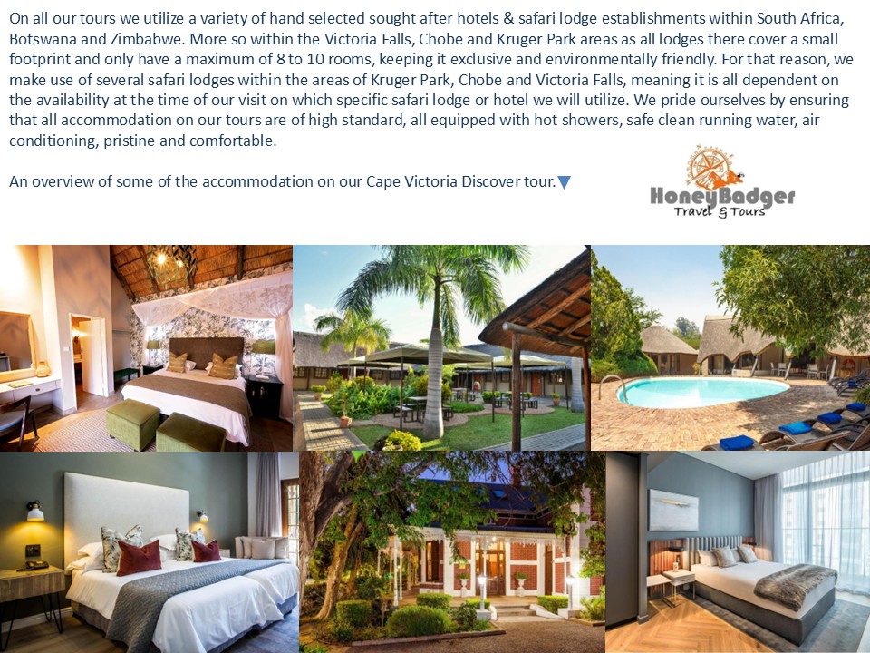 SMALL GROUP TOUR EXPERIENCE Embark On A Journey Of Discovery To Some Of The Best That Southern Africa Has To Discover…An Amazing Green Canyon Along The Panorama Route As You Make Your Way To Kruger National Park With It's Immense Bushland Savannah Teaming With Majestic African Wildlife …After A Thorough Exploration Of Chobe National Park, Take A Wander Along The Banks Of The Chobe & Zambezi Rivers As It Leads You To One Mighty Waterfall, The World Famous Victoria Falls. A Coastal Metropolis Awaits With It's Scenic Mountain Backdrop Of Table Mountain... And Then Journey To The Whale Bay Of Hermanus To Explore Its Spectacular Coastline... Meander Your Way To The Southern Most Tip Of The African Continent Cape Agulhas And See Where Two Oceans Meet. Continue The Journey Through To The Picturesque Stellenbosch Winelands And Take In True Beauty.