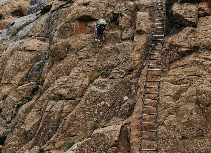 The Chain Ladder Route in South Africa is a hiking path that leads to the top of the Drakensberg Mountains. It is well known for chain ladders, which help the climbers up an almost vertical rocky face. The route starts and ends from the Sentinel Car Park and peaks on the top of Africa's tallest waterfall, the Tugela Falls, dropping down some 948 meters into the Tugela valley below.